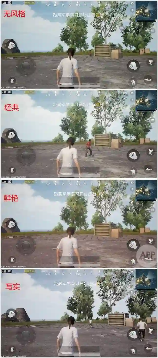 和《全军出击》类似,《刺激战场》也提供了多种画面模式,有「经典」、「鲜艳」、「写实」和「无风格」四种可选,不过整体还是偏寡淡的。
