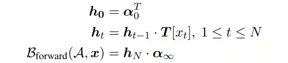 ht 类似 RNN 中的隐状态向量,他的维度等于自动机状态数。ht 的每一个维度就表示:在读了 t 个单词之后,有多少条路径能够从开始状态到该维度对应的自动机状态。