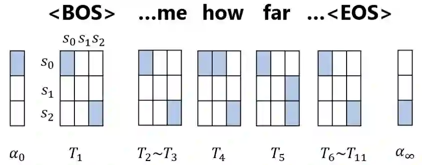 如下图所示,对于一个句子,我们可以得到每一个单词的转移矩阵,若该矩阵的第 i 行第 j 列为 1,则表示可以通过该单词从状态 si 转移到 sj。因此,我们可以用前向算法(forward algorithm)或者维特比算法(viterbi algorithm)来计算句子被该自动机接受的分数。