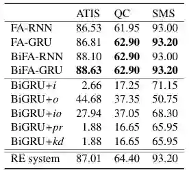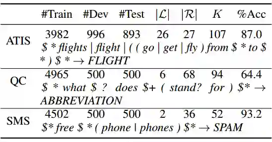 我们发现,训练过后的 FA-RNN 转化为的正则表达式,虽然是有损的转化,也能达到和训练之前的系统相近甚至更高的准确率。在 QC 数据集上提升了 9.2% 的准确率,在 ATIS 上提升了 0.45%,在 SMS 上稍有下降 (-1.2%)。