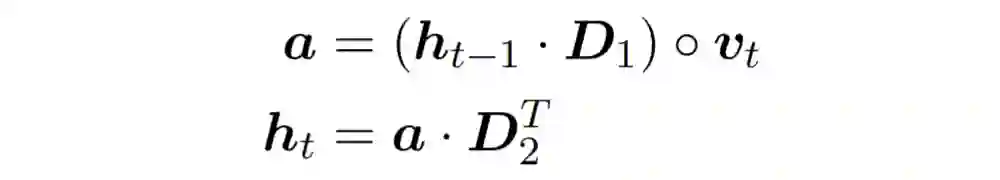 记 t 时刻的输入为 x_t, 我们可以把 ER 看成一个只包含规则信息的词嵌入矩阵,vt 则是 ER 矩阵的对应行选出的 R 维词向量。由此,我们模型的参数量大大减少,相当甚至更少于 LSTM, GRU 等循环神经网络。