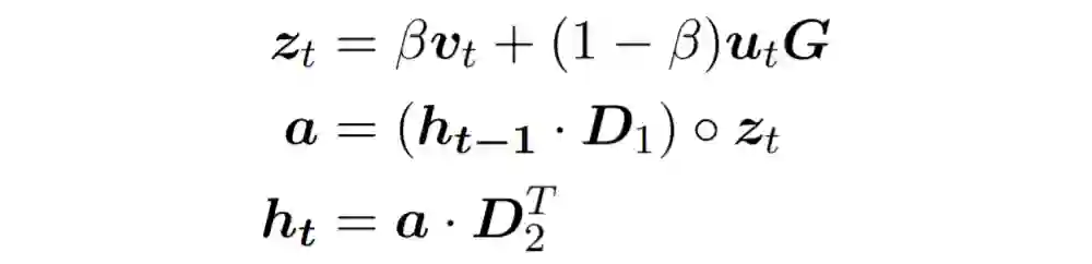 接下来我们介绍我们结合词向量(如:glove)的方法。为了结合 D 维度的词向量,我们利用一个 DxR 的矩阵 G 将词向量从 D 映射到 R 维空间,这个矩阵 G 可以初始化为词嵌入矩阵 Ew 的违逆乘上 ER。我们再引入一个 0,1 之间的超参数来结合 vt 与 G 映射后的两个 R 纬词向量,控制接受多少词向量语义的信息,更新公式变为如下: