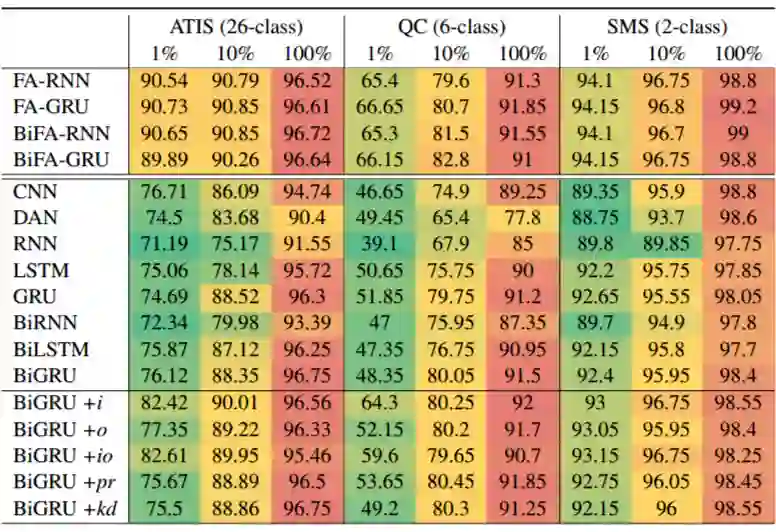 我们发现,FA-RNN 在 zero-shot 以及 low-resource 的场景下有着明显的优势,并且在 full-shot 上仍然能够得到与传统简单神经网络方法以及其经过规则加强后相似的准确率。结果如下: