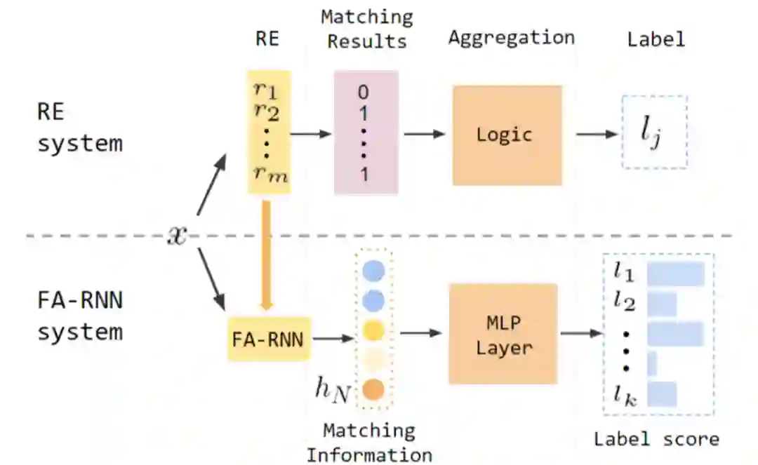 有了 FA-RNN,我们就可以用它构造规则系统的“神经网络版本”,如图二的下半部分所示。FA-RNN 的最后一个“hidden state”包含了正则表达式的匹配信息,我们可以通过一个 MLP 来整合匹配结果。