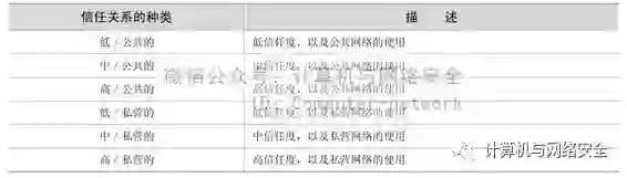 一旦现有的或计划建立的网络的特点得到确认,并且至少已确认了该网络是公共的还是私营的,那么就应当确定相关的信任关系。