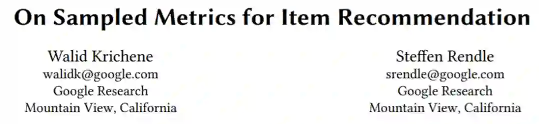 最佳论文奖由来自谷歌研究院的 Walid Krichene 和 Steffen Rendle 获得,获奖题目为《On Sampled Metrics for Item Recommendation》
