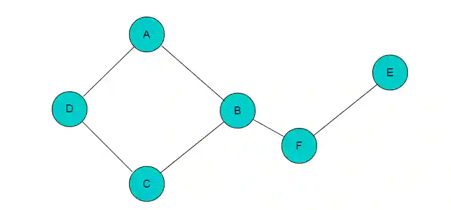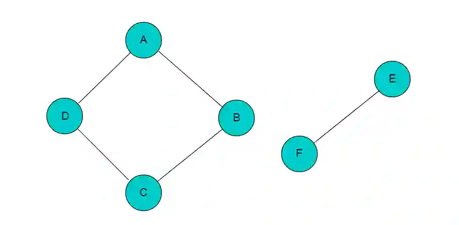 例如:图4.1所示图,图中顶点A、B、C、D是连通的,但是其中任一顶点与顶点E或者顶点F之间没有路径,因此图4.1中所示的图为非连通图。
