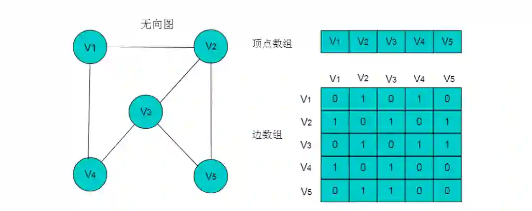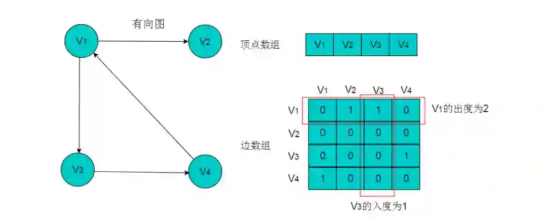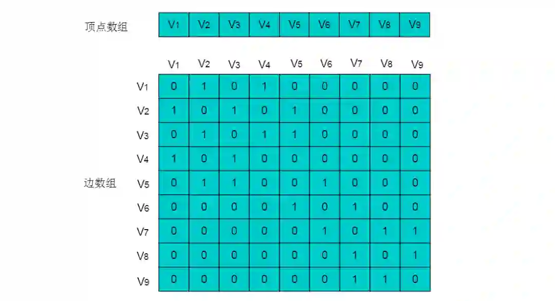 注:图中的数组存储方式简化了边的权值为 1 。