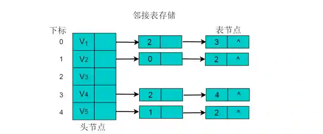(2)链表的长度即为顶点的出度。例如V1的出度为2,V1为头节点的链表中,表节点的数目为2。