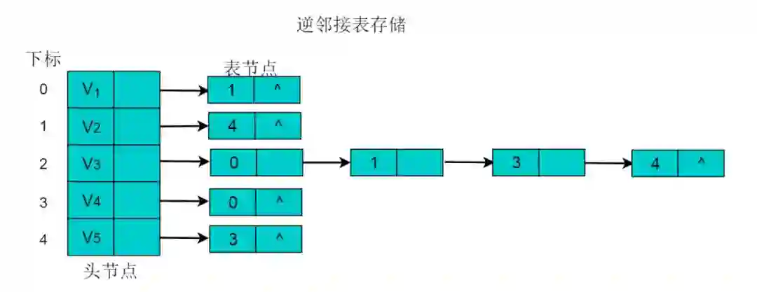 在邻接表中,可以轻易的得出顶点的出度,但是想要得到顶点的入度,则需要遍历整个链表。为了便于确定顶点的入度,可以建立有向图的逆邻接表。逆邻接表的建立与邻接表相反。