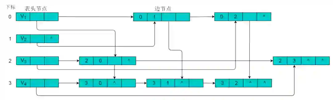 注:图采用邻接表的方式表示时,其表示方式是不唯一的。这是因为在每个顶点对应的单链表中,各边节点的链接次序可以是任意的,取决于建立邻接表的算法以及边的输入次序。