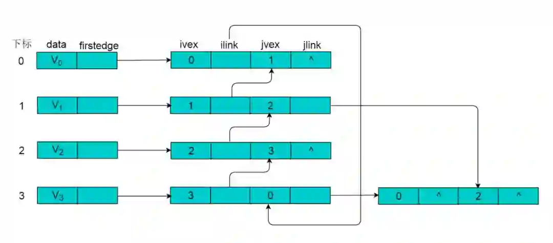 (3)顶点Vi的入度为邻接表中所有adjvex值域为i的表结点数目。例如:顶点V3的入度为4,则链表中所有adjvex值域为2的表结点数目为4。