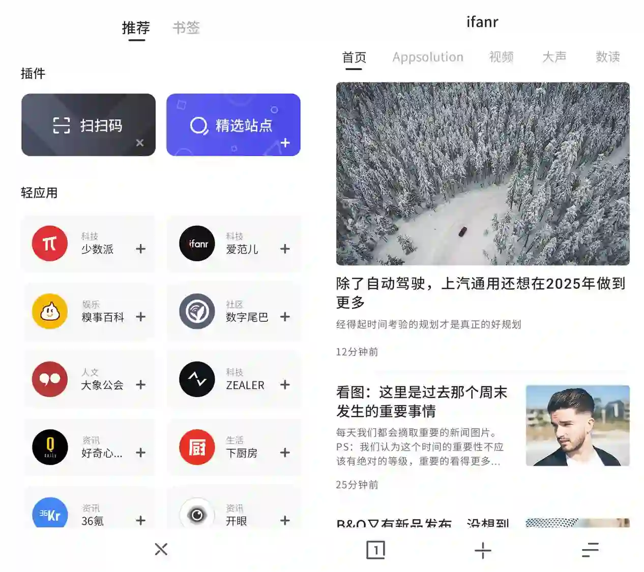 夸克的轻应用,其实是精选了用户最经常访问的35家媒体,统一排版、打通内容、去除广告,做了一个“最纯净”的内容分发。用户可在搜索栏的下方,自由添加开眼、虎嗅等优质站点。值得强调的是,轻应用不是广告,不存在任何商业性质的交易。