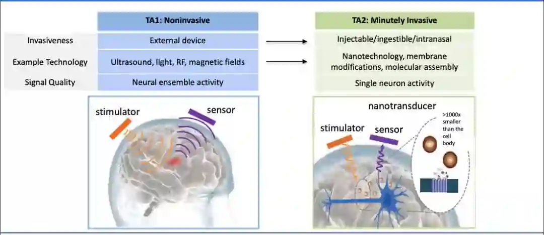 该技术专注于两种方法:无创和精创神经接口。无创神经接口通过外部刺激器和传感器实现机器与脑神经的直接通信;精创神经接口将纳米传感器精确导入特定脑神经位置,与外部传感器和刺激器相互作用,实现机器与该位置脑神经的直接通信。