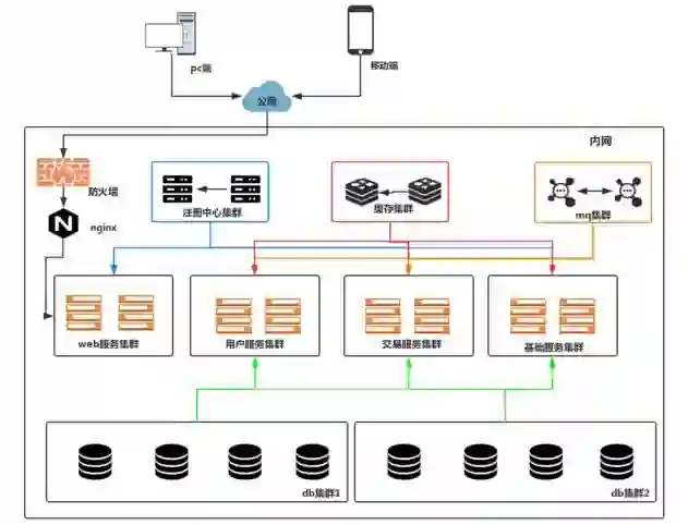 我们也可以按访问入口分,如移动端、PC 端等定义不同的接口应用。数据库可以按业务类型拆分成多个实例,还可以对单表进行分库分表。同时增加分布式缓存、消息队列、非关系型数据库、搜索等中间件。
