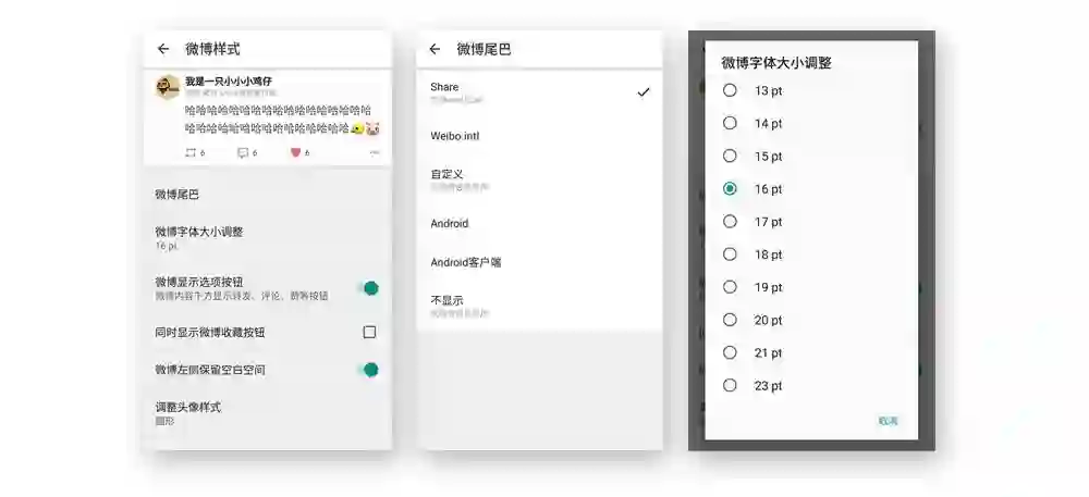 「Share」使用了 Material 的界面设计,UI 效果清新简约。为了提供更好的阅读体验,「Share」还提供了不少的对界面的个性化设置。微博尾巴、字体大小、是否显示评论的按钮、是否留白等功能都可以在后台中按自己的喜欢设置。