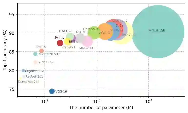 最近几年,深度学习在 ImageNet 图像分类任务上的进展主要得益于对视觉模型容量的大幅度扩增。如图1所示,短短几年时间,视觉预训练模型的容量扩大了300多倍,从4,450万参数的 ResNet-101 模型,进化到了拥有150亿参数的 V-MoE 模型,这些大型视觉预训练模型在图像理解和视觉内容生成等任务上都取得了长足进步。