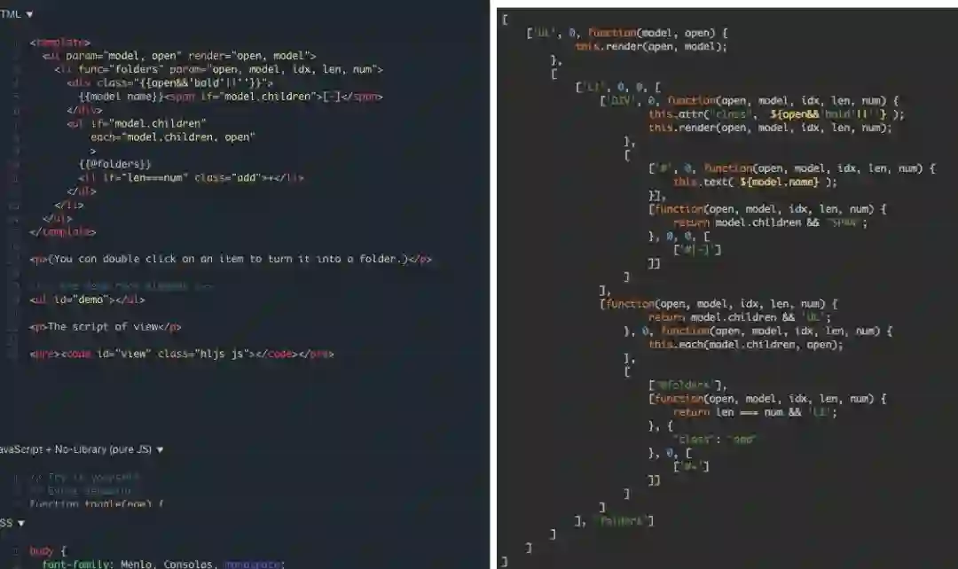 至少也要有类似 React-JSX 这样的编译结果才具有可调试性。备注:Vue.js 支持多种模板引擎,可达到同样的效果。
