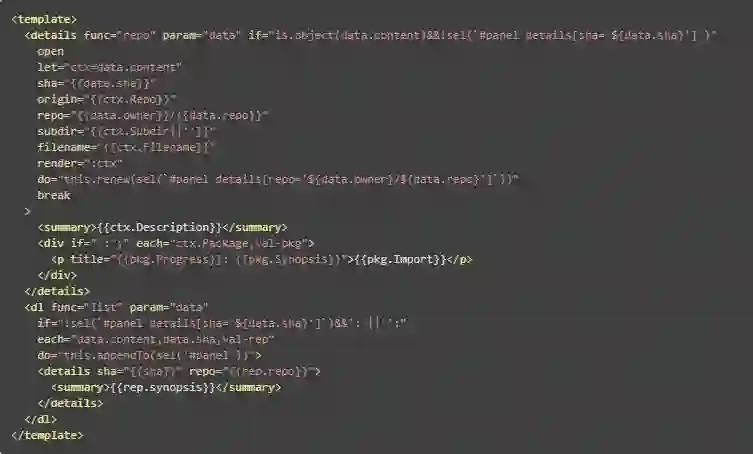 今天在 OSC 搜索 JavaScript 模板引擎你会得到 100+ 个结果,下边列举一些: