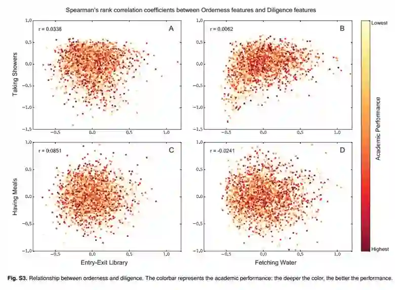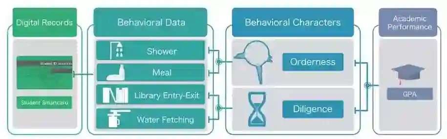 基于近两万名大学生的校园刷卡记录数据,包括食堂吃饭、寝室洗澡、教学楼打水和图书馆进出4种行为约3000万条刷卡记录,可以构建出两类高阶的行为特征(有序性和努力程度),并与学习成绩形成关联。最终,利用机器学习算法,根据学生的行为特征预测他们的学习成绩。