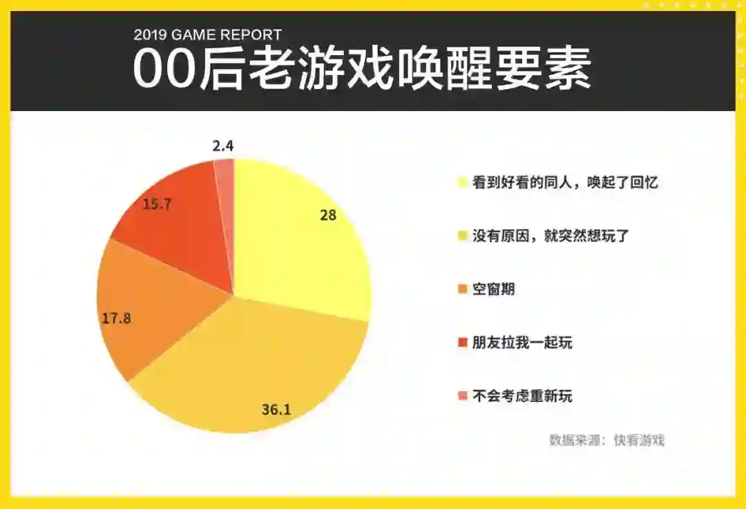 在“你会因为什么原因重新玩一款曾经玩过的游戏?”问题下,28%的玩家选择“看到好看的同人,唤起了回忆”,仅次于“没有原因,就突然想玩了”的36.1%,远高于“空窗期”的17.8%和“朋友拉我一起玩”的15.7%。
