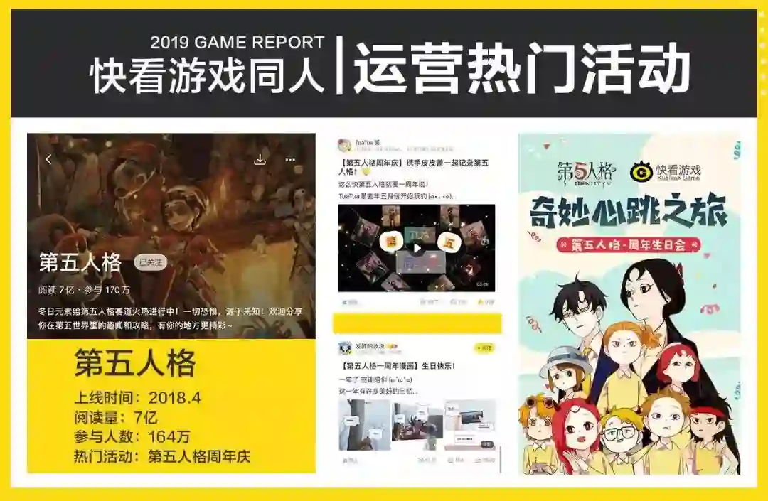 《第五人格》是一款上线于2018年4月的“老游戏”。凭借对于游戏同人活动的持续投入,《第五人格》在过去的两年中维持了较高热度。在快看漫画,《第五人格》专题页拥有7亿阅读,仅“第五人格周年庆”一个活动就吸引了数万粉丝参与。