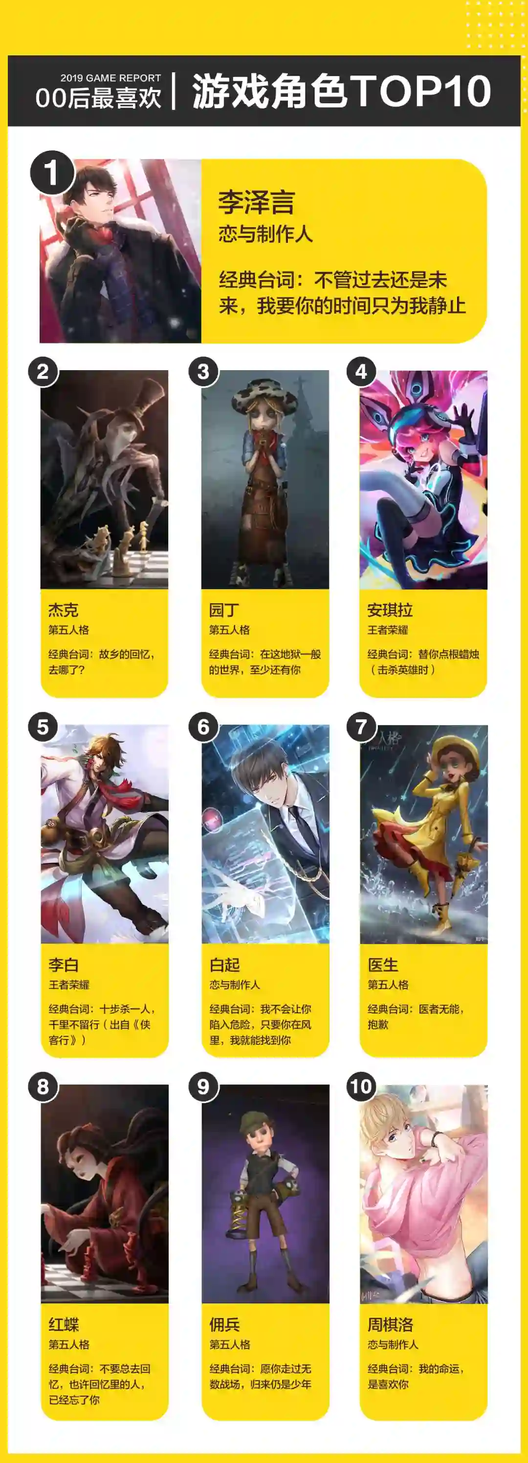 在“自己最喜欢的游戏角色”评选过程中,得票最高的前十名游戏角色均为游戏初始或者早期角色。