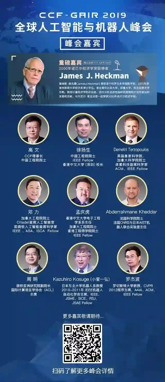 届时,诺贝尔奖得主JamesJ. Heckman、中外院士、世界顶会主席、知名Fellow,多位重磅嘉宾将亲自坐阵,一起探讨人工智能和机器人领域学、产、投等复杂的生存态势。