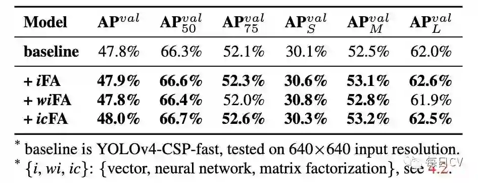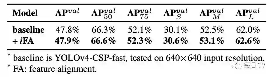 使用简单的向量隐式表征和加法算子,在FPN的每一个特征映射层添加隐式知识进行特征对齐,各个指标获得到了有意义的提升,如表1所示。