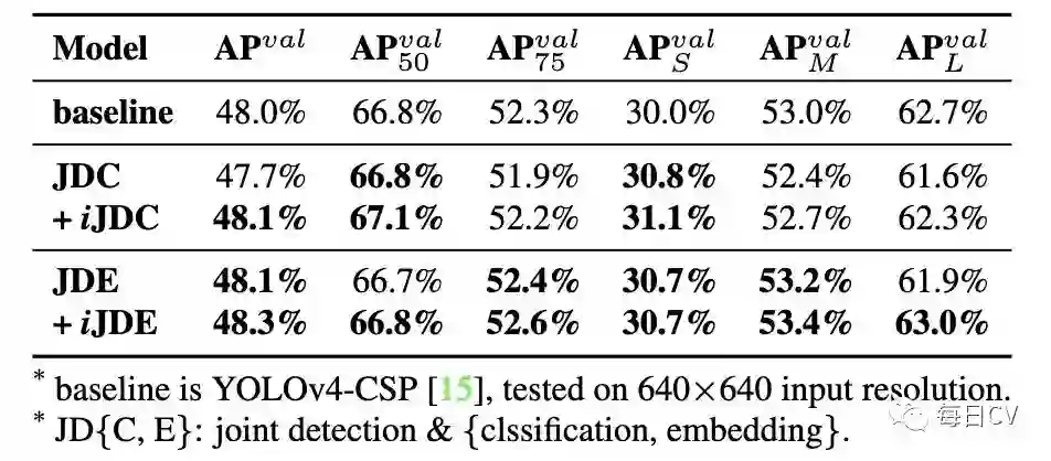 当需要同时训练一个被多个任务共享的模型时,由于损失函数的联合优化过程是必须执行的,因此在执行过程中往往会出现多方相互拉动的情况,这种情况将导致最终的整体性能比单独训练多个模型然后集成它们要差。为了解决这个问题,作者提出为训练多任务训练一个规范的表征,通过给每个任务分支引入隐式表征增强表征能力,表3展示了使用简单的向量隐式表征和加法算子进行不同联合训练方式的结果,+iJDDE(检测和特征嵌入联合训练,引入加法隐式表征)取得了最好的对比结果。