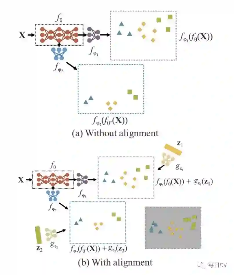 在多任务和多头神经网络中,核空间不对齐是经常发生的问题,图4(a)展示了一个多任务多头神经网络核空间不对齐的例子。为了解决这个问题,如图4(b)所示,可以对输出特征和隐式表征进行加法和乘法运算,这样就可以对核空间进行变换、旋转和缩放,以对齐神经网络的每个输出核空间。该方法广泛用于多个领域,比如说FPN中大目标与小目标的特征对齐、知识蒸馏中大模型与小模型的整合、处理zero-shot域迁移等问题。
