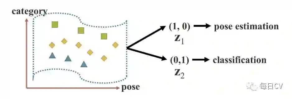 训练过程中最小化 , 这表示我们期望同一目标的不同观测值是 所得到的子空间中的一个 点, 如图6 (a) 所示。换言之, 我们期望得到的解空间只对当前任务 有区别, 对各种潜在 任务中除 以外的任务是不变的, 其中 。(解释: 以图6 (a) 为例, 不同颜色的圆形解空间只对不同颜色的形状任务 有变化, 比如绿色方形对应绿色圆形, 而 蓝色三角形对应结果就变化成了蓝色圆形,但是对绿色方形类内的不同观测值(潜在任务), 如位置的变化, 其对应的解空间是不变的。)