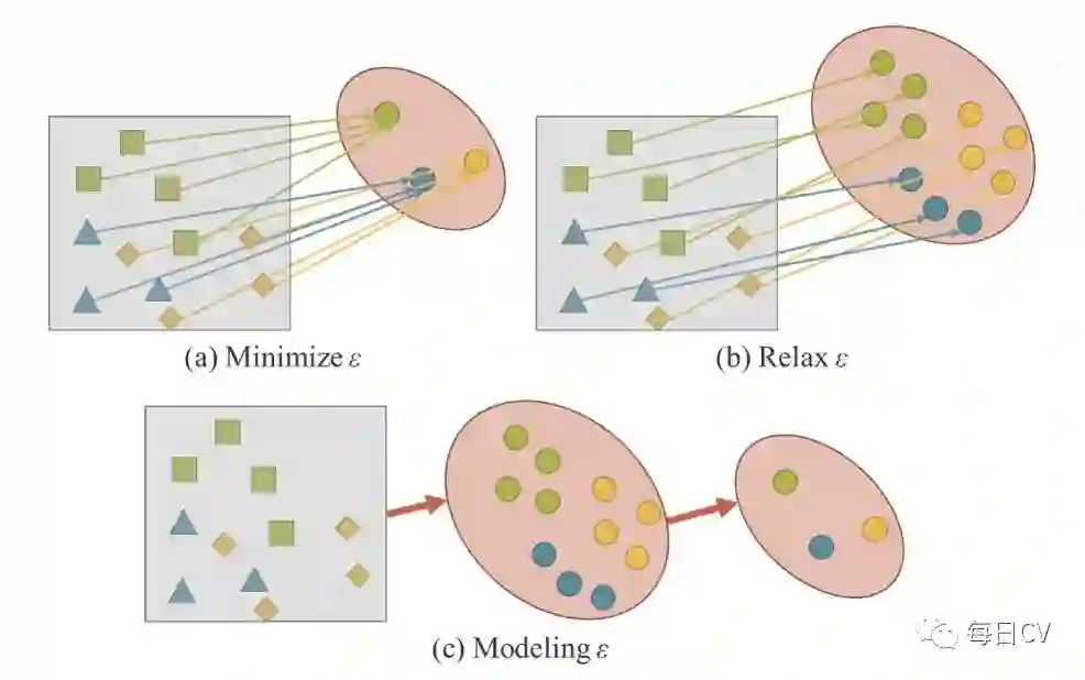 对于更通用的神经网络, 我们希望获得的表征可以服务于其他所有属于 的任务(既各种潜 在任务), 因此需要松弛 , 以便能够在流形空间上同时找到每个任务的解, 如图 6 (b) 所 示。然而, 上述要求使得我们不可能用简单的数学方法, 如一个热独向量的最大值或欧氏距离 的阈值来求解 。为了解决这个问题, 我们必须对错误项进行建模, 以便为不同的任务找到解 决方案, 如图6 (c) 所示。