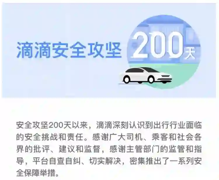 随后滴滴全面启动了安全攻坚战,几乎将安全作为唯一核心考核指标,并在其官方公众号不断公布着“安全攻坚”的新进展,至今已持续超过200天之久。