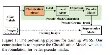 语义分割(Semantic Segmentation)任务需要对输入图像中的每一个像素都进行类别预测。因此想要训练一个全监督的segmentation模型,则首先需要消耗大量的人力、财力对训练图像进行逐像素的标注。为缓解这个问题,人们利用一些较容易获取的弱标签(Weak Label)作为图像的监督信息来训练segmentation模型。比如,常见的弱标签有Bounding Box、Scribble、Point以及Image-level class label。我们的研究内容是基于image-level class label的,其是这些弱标签中是容易获取但也是最难处理的,因为image-level class label本身只提供了图像的类别信息而没有目标在图像中的位置信息。目前流行的基于image-level class label的弱监督segmentation模型主要分为以下三个步骤进行,如图1所示:1)首先通过multi-label image classification模型获取图像的类响应激活图(Class Activation Map)作为种子区域(Seed Area);2)在种子区域的基础上,通过计算像素之间的语义相似性对种子区域进行扩张(Exoansion)得到图像的伪标签(Pseudo-Mask);3)使用伪标签作为Ground-Truth训练一个全监督的语义分割模型,并在训练好的模型上对val/test集合进行预测。