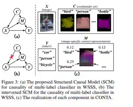 CONTA是第一个使用因果图来分析弱监督语义分割模型中各component之间的关系,从而找出了造成现有的pseudo-mask不准确的本质原因是因为数据集中的上下文先验是混淆因子。在此基础上,我们又进一步提出了使用因果干预切断上下文先验和图像之间的关联,从而提升pseudo-mask的质量。