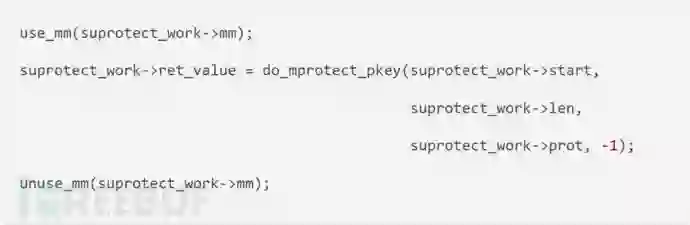 在内核线程中运行代码有一种简单方法,就是内核的工作队列接口,它允许你使用特定例程和特定参数来安排工作。我们的例程获取所需进程的内存映射对象和mprotect的参数,并执行以下操作(do_mprotect_pkey是内核中实现mprotect和pkey_mprotect系统调用的内部函数):