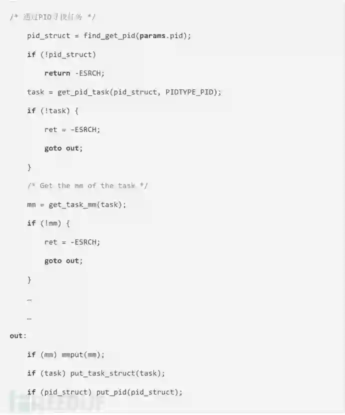 尽管存在这些问题,我们仍以mprotect的本质进行尝试,甚至仅用于教育目的。因此,我们开始编写一个内核模块,它获取mprotect目标PID和参数,并模仿其行为。首先,我们需要获取所需的内存映射对象,它表示线程的地址空间: