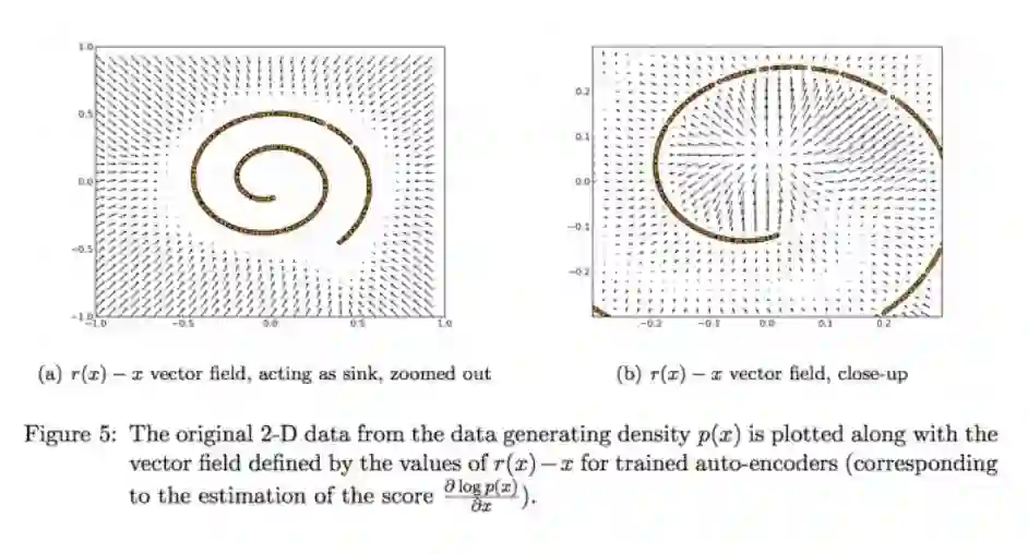 我们经常在机器学习中遇到的则是另一个种(但不经常将其视为矢量场)是由自动编码器定义的矢量场。 AE的输入一些向量x,并返回另一个相同大小的向量v(x)。比如在图5是Alain和Bengio在201年对2D数据的自动编码去噪声的矢量场训练,效果相当不错: