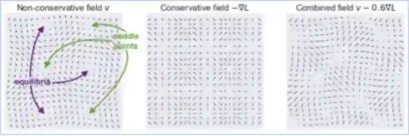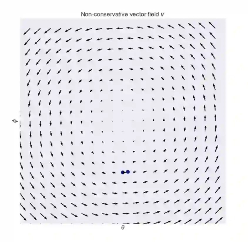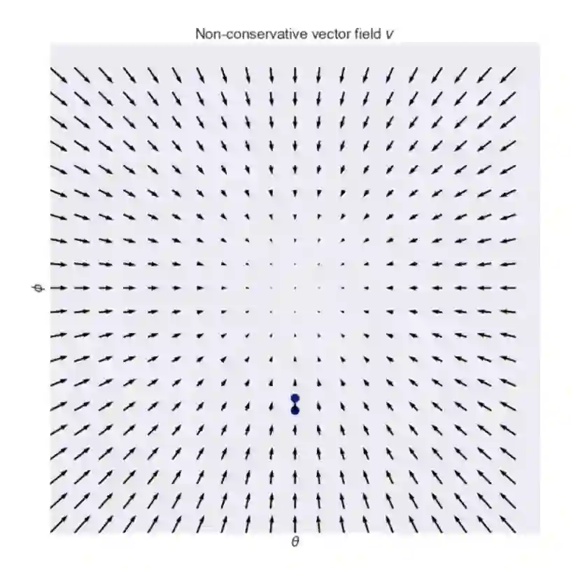 这个向量场在零和游戏中经常出现(译者注:zero-sum game就是指“零和博弈”,指参与博弈的各方,在严格竞争下,一方的收益必然意味着另一方的损失,博弈各方的收益和损失相加总和永远为“零”,双方不存在合作的可能),其中