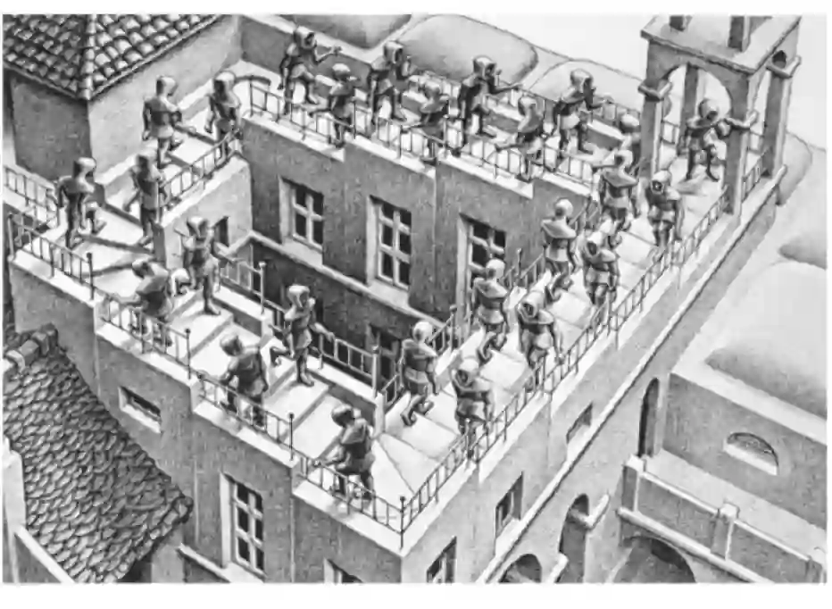 可以把此矢量比作与埃舍尔的《不可思议城堡》(译者注:埃舍尔,荷兰 版画家,因其绘画中的数学性而闻名,有兴趣的可以看看《不可能存在的存在》:http://www.360doc.com/content/17/0705/08/27794381_668875548.shtml)。在埃舍尔的“不可能存在的城堡”中,仆人认为他们正在上台阶或者是在下台阶,但实际上他们所做的都是围绕着圈子。当然如果要将Escher的城堡构建成是一个真正的3D 模型则是不可能的。类似地,不可能将卷积矢量场表示为标量函数的梯度。