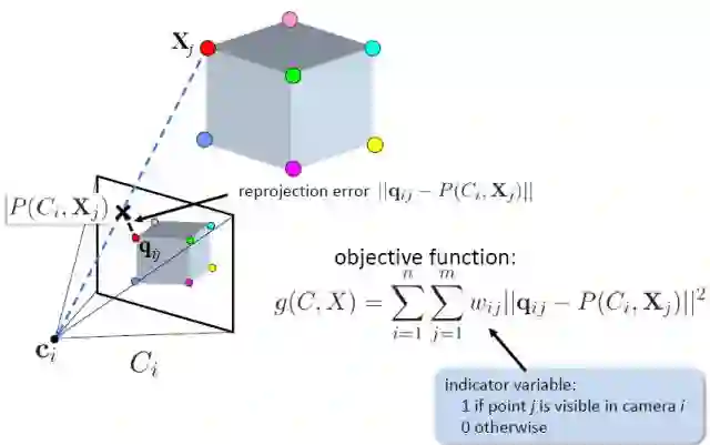 Bundle Adjustment(BA)中文有多种翻译法:光束法平叉、束调整、捆集调整、捆绑调整等。BA的本质是一个优化模型,其目的是最小化重投影误差。什么是重投影误差呢?