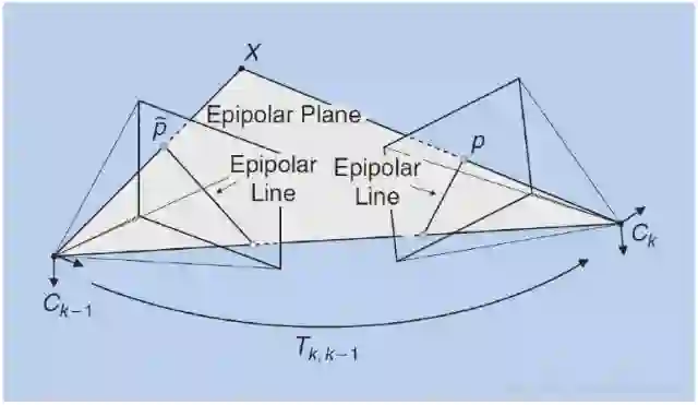 如图所示,空间点X和两个相机中心点Ck-1、Ck形成了3D空间中的一个平面,称为极平面(epipolar plane)。极平面和两幅图像相交于两条直线,这两条直线称为对极线(epipolar line)。从图中看如果已知了正确的特征点匹配对p,p',那么可以推断出三维点X的空间位置,以及相机的运动。