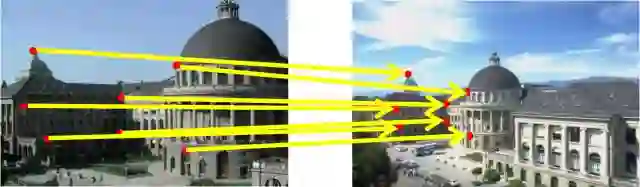 特征匹配示意图。红色为特征点,黄线表示匹配成功的特征点对
