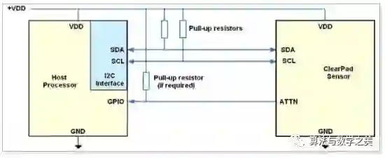 左边是处理器,右边是触摸屏控制器,中间的 SDA 和 SCL 连线就是 I²C 总线接口。