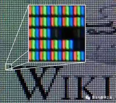 LCD 屏幕上的每个物理像素点实际上是由红、绿、蓝 3 种色彩的点组成,每个颜色点能单独控制,下面是用显微镜放大后的情况(来自 Wikipedia):