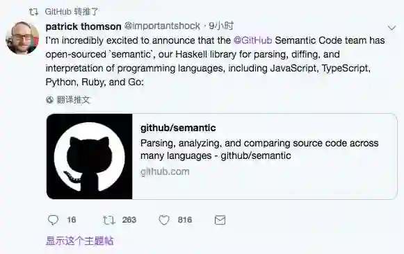 刚刚,GitHub Semantic Code 团队宣布开源 semantic 库。这是一个 Haskell 库,用于解析、对比、解释多种编程语言,目前该库支持 JavaScript、TypeScript、Python、Ruby 和 Go 等多种语言。