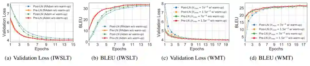 在 IWSLT、WMT 和 BERT 三个任务上验证了是否可以在 Pre-LN 结构中去掉 warm-up: