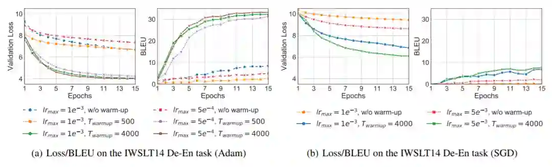 我们在 IWSLT14 De-En 翻译数据集上使用 Transformer 模型对这一观点进行验证,采用 Adam 和 SGD 两种随机优化器,分别测试了两种学习率(1e^-3, 5e^-4)在没有 warm-up(0轮), warm-up 迭代轮数不足(500轮)和迭代轮数充足(4000轮)情况下模型的验证集 Loss 与 BLEU 分数。