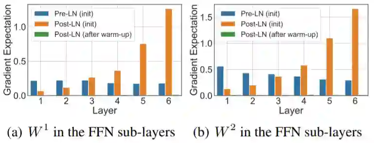 可以看出,相比于 Post-LN 结构梯度分布的不稳定,Pre-LN 在各层之间梯度范数几乎保持不变,这种结构明显更利于优化器进行优化。而在进行一定轮数的 warm-up 后,Post-LN 的梯度范数也基本保持不变,并且其量级非常小(图4中绿色),这也验证了我们的结论。